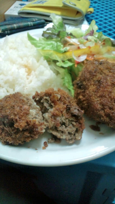 昨日は日本勝ちましたね~ いやーラスト4分の川島にはやられましたね(´~`) 興奮のあまり飛び跳ねましたもん! 次は19日、オランダか・・・願えば叶う!勝つんだ日本((○(>_<)○)) はい~本日のまかないは ・むっちゃん特製メンチカツ これがね、絶品なのです 肉汁じゅわじゅわ! 敢えて何も付けないで食べるのが私のこだわりです♪ ※写真が下手くそで申し訳なす